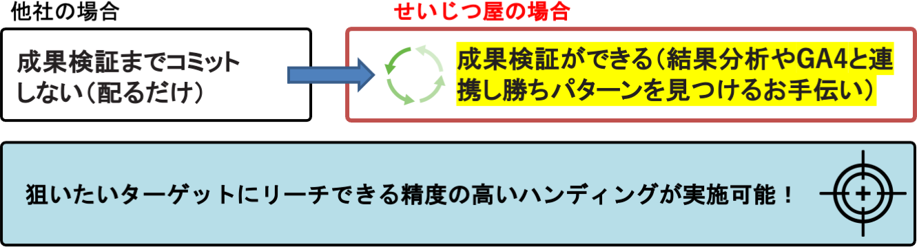 せいじつ屋は『データで改善するオフライン施策』に取り組んでいます。その一例として、チラシ配布は、他社サービスにはない特長を持っています。オフラインとオンラインを融合させることで、成果検証を可能にし、高品質なサービスになりました。
