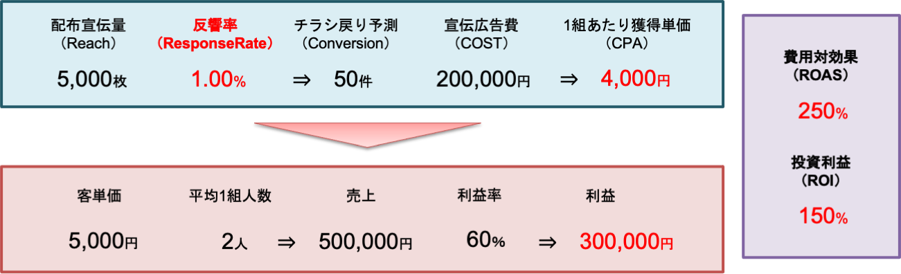 配布宣伝量と業種別の反響率を基にしたオフライン集客シミュレーション