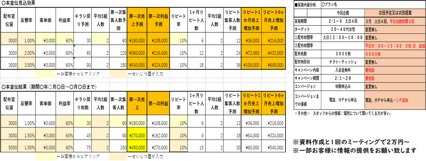 配布実施内容分析シート、反響結果分析シートを使い次回対策のミーティング実施