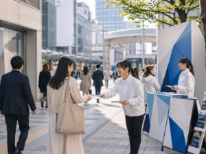 街頭配布やチラシ配布は、オフライン広告の中でも特にリアル接触性が高い手法です。